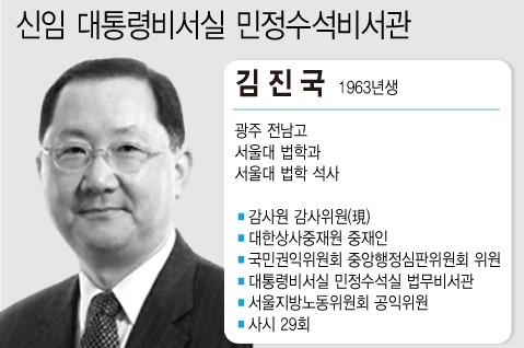 김진국 신임 민정수석은 광주 전남고등학교를 거쳐 서울대 법대를 졸업했다. 동 대학원 석사 학위를 받았다. 사법고시 29회 출신으로 변호사를 지낸 김 수석은 참여정부에서 청와대 법무비서관을 지냈다.