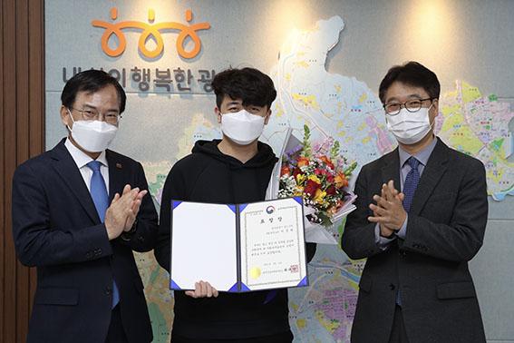 이어 사회복무요원을 격려하고, 특별히 이준혁 사회복무요원에게 표창장과 부상품을 수여했다. 이준혁 요원은 사회복무요원으로 광산구청 행정지원분야에 복무하면서 시각장애인인 직원 박 주무관의 길잡이 역할 등 행정보조 업무를 성실히 했을 뿐 아니라 자신의 컴퓨터공학 전공을 살려 시각장애인들이 구청 내부 구조를 확인 할 수 있는 ‘음성지원 안내 전자지도’를 제작한 공로로 수상하게 됐다.