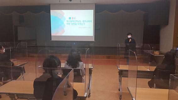 4일 광주동부교육지원청에 따르면 이번 직장교육은 대회의실에서 대면 방식으로, 6개 부서 각 사무실에서는 실시간 영상을 통한 비대면 방식으로 동시 진행됐다. 강사로 초빙된 광주교육정책연구소 김옥희 연구원이 ‘빛고을혁신학교는 광주교육에 어떤 영향을 미쳤는가’를 주제로 강의했다.