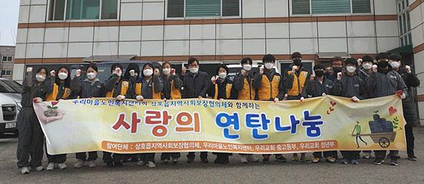 영암군 삼호읍은 삼호읍지역사회보장협의체는 우리마을노인복지센터와 우리교회 중고등부, 청년부 자원봉사자 20여명이 참여해 ‘사랑의 연탄나눔’봉사활동을 진행했다고 밝혔다.