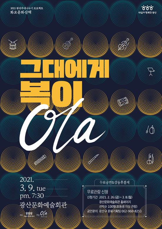 광산구는 올해 화요문화산책 공연을 상·하반기로 나눠 총 10회 진행한다. 지난달 상반기 공모로, 올라 이외에도 4월 13일 루체앙상블의 ‘열정과 힐링 사이’, 5월 11일 그나데첼로콰르텟의 ‘시네 클래식(cine classic)’, 6월 8일 애시드브레이커즈의 ‘Colorfull 광산! 힙쇼! (BOY들과 랩퍼의 콜라보)’, 7월 13일 카피바라스튜디오 ‘The garden: Blue Rose’ 공연이 이어질 예정이다.