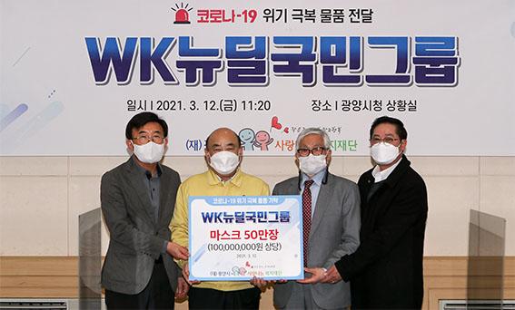 광양시는 WK뉴딜국민그룹에서 코로나19 위기 극복 및 감염 예방을 위해 1억 원 상당의 덴탈마스크 50만 장을 (재)광양시사랑나눔복지재단에 기탁했다고 15일 밝혔다.