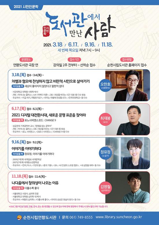 시민인문학 ‘도서관에서 만난 사람’은 책읽는 도시 순천 기반 조성사업으로 문학·역사·철학·예술 등 다양한 분야의 저명인사를 초청해 순천시민의 인문학적 소양을 높이고 풍요롭고 행복한 삶을 위해 마련된 것으로 2014년부터 지속해 오고 있다.