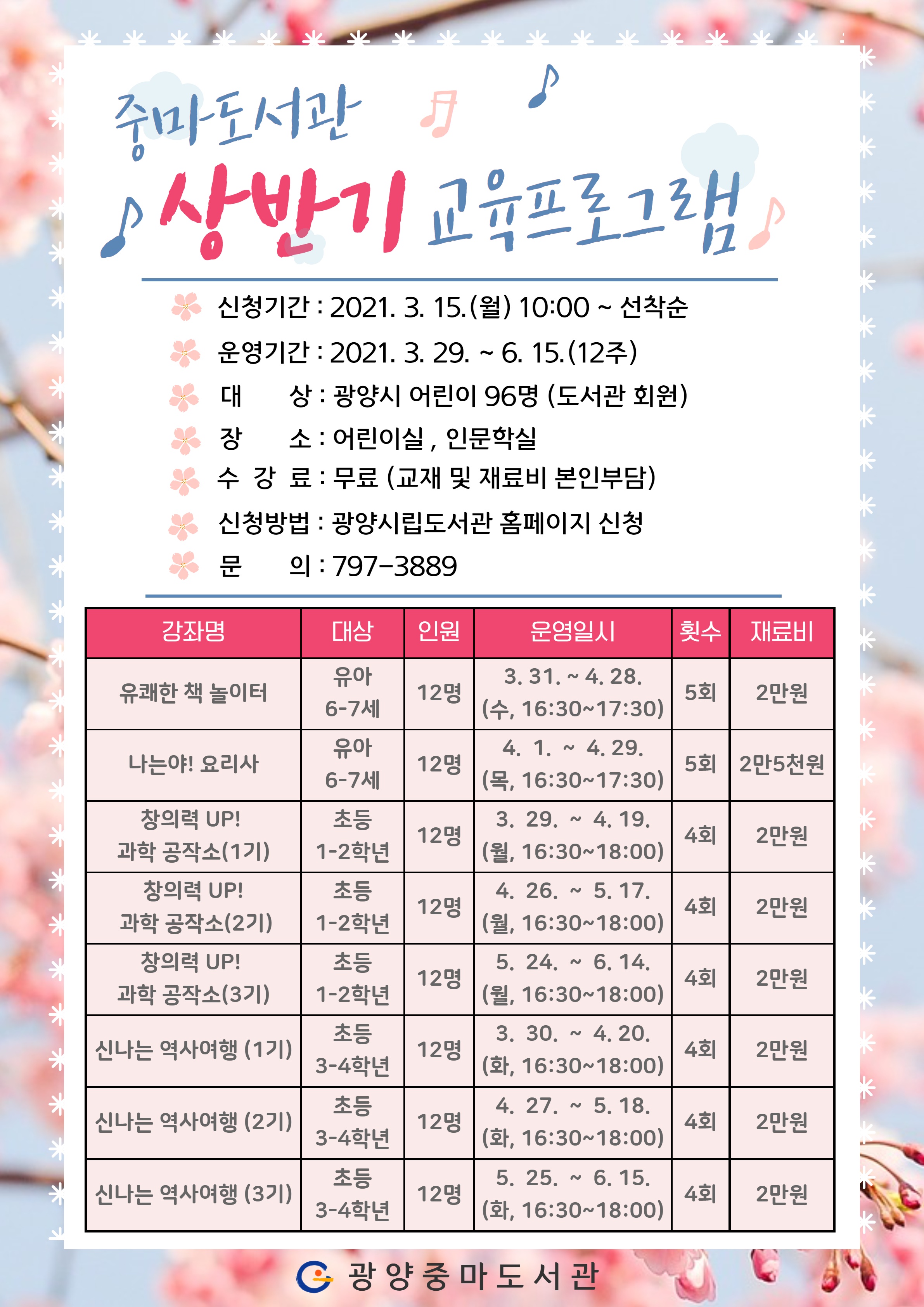 유아를 대상으로 한 ‘나는야! 요리사’, ‘유쾌한 책 놀이터’ 2개 강좌는 그림책과 연계한 독후활동 수업으로 독서에 흥미를 가질 수 있도록 운영하며, 초등학생 대상으로 ‘창의력UP! 과학 공작소’, ‘신나는 역사여행’ 강연을 과학·역사이야기 분야 전문 강사를 초빙해 진행할 계획이다.