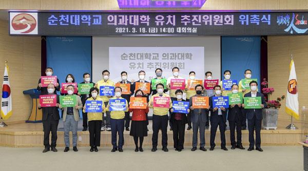 지난해 11월 ‘순천대학교 의과대학 유치 지원 및 추진위원회 운영에 관한 조례’를 제정하여 유치 활동에 법적 근거를 마련하고, 유치 지원에 박차를 가하고 있다. 의대유치 서명운동에 동부권 주민 50만여 명이 참여하는 등 시민들의 적극적인 지지도 이러한 행보에 큰 도움이 되고 있다.