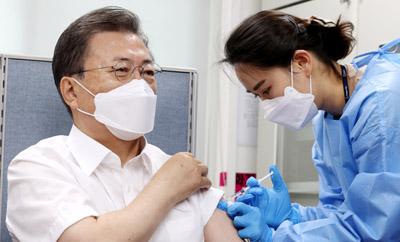 문재인 대통령이 23일 오전 서울 종로구보건소에서 아스트라제네카(AZ)사의 코로나19 백신을 접종하고 있다.