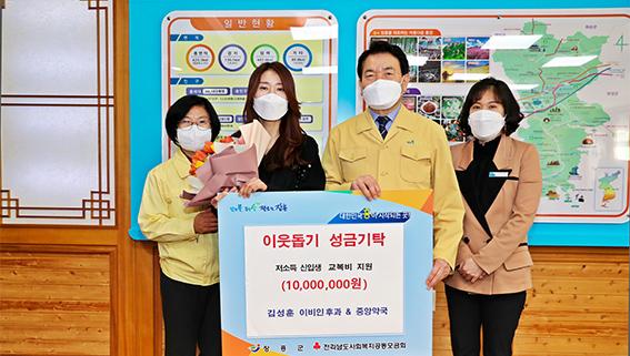 장흥군(군수 정종순)은 지난 23일 김성훈이비인후과와 중앙약국에서 장흥 지역 저소득가정 중·고등학교 신입생들에게 사용해 달라며 1천만 원을 기탁했다고 밝혔다.