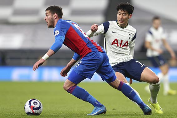 손흥민(오른쪽)이 7일(현지시간) 영국 런던의 토트넘 홋스퍼 경기장에서 열린 크리스털 팰리스와의 2020-21시즌 잉글랜드 프리미어리그(EPL) 27라운드에 선발 출전해 경기하고 있다. 손흥민은 해리 케인과 'EPL 단일 시즌 최다 골'을 합작해 리그 9호 도움을 기록하며 팀의 4-1 승리를 이끌었다. 2021.03.08.