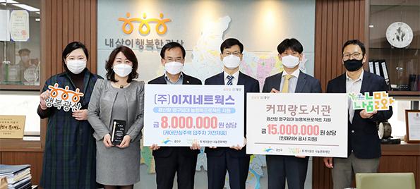 광주 광산구에 따르면 커피랑도서관과 ㈜이지네트웍스가 각각 1500만 원과 800만 원을 지난 29일 투게더광산나눔문화재단에 기탁했다. 두 회사의 기탁금은 영구임대 늘행복 프로젝트에서 제공한 사업을 금액으로 환산한 것이다.