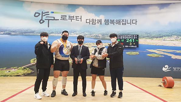 이양재는 지난달 27일부터 30일까지 강원도 양구에서 열린 2021 한국실업역도선수권대회에 출전해 남일부 109kg급에서 인상 186kg, 용상 230kg, 합계 416kg을 들어올려 3관왕 달성과 함께 대회 최우수선수상을 수상했다.