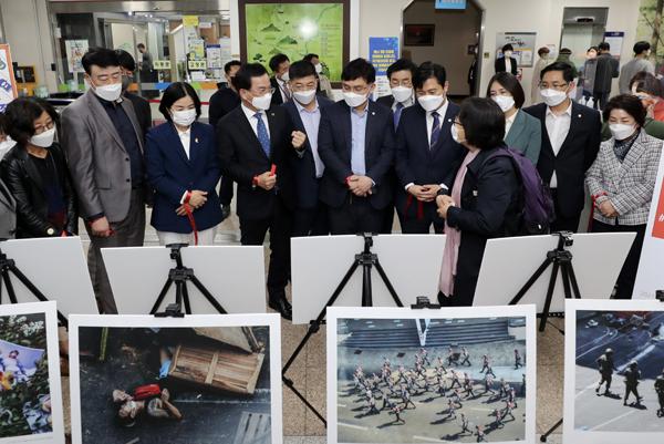 사진설명) 30일 오후 광산구청 로비에서 김삼호 구청장, 이영훈 광산구의회 의장 등이 참석한 가운데 ‘#Save Myanmar!’ 사진전이 열렸다. /이동기 기자
