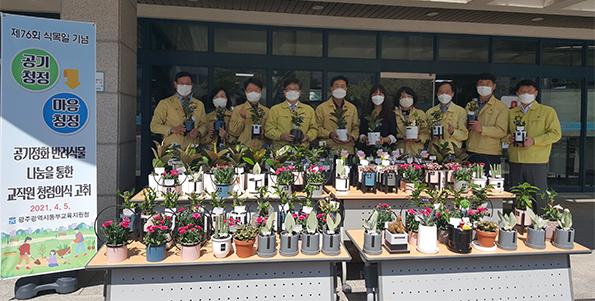 광주동부교육지원청이 5일 2021년 제76회 식목일을 맞아 1층 현관 로비에서 ‘공기정화 반려식물 나눔 행사’를 통한 청렴 캠페인을 진행했다.
