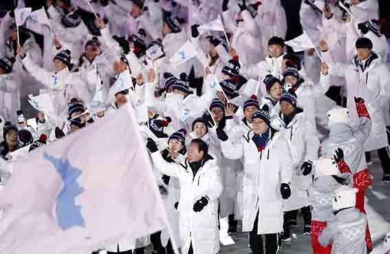 강원 평창올림픽플라자에서 열린 평창동계올림픽 개회식에서 남북이 공동입장 하고 있다.