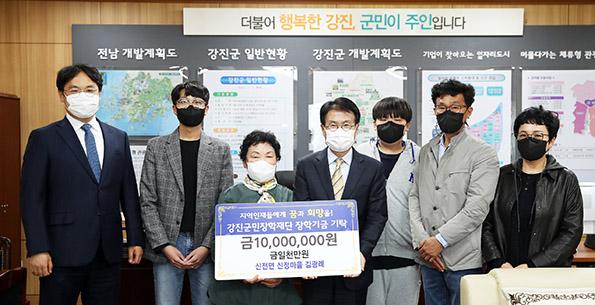 지난 9일 신전면 신정마을 김광례 씨(73세)가 20여 년 전 어려웠던 시기에 강진군에서 받았던 아들의 장학금 지원에 대해 보답을 하고자 강진군민장학재단에 1000만 원의 장학금을 기탁해 지역 사회에 선한 영향력을 펼쳤다.