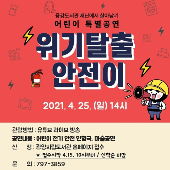 광양용강도서관은 오는 25일, 어린이를 위한 특별 공연으로 마술 인형극 ‘위기 탈출 안전이’를 유튜브를 통해 선보인다고 밝혔다.