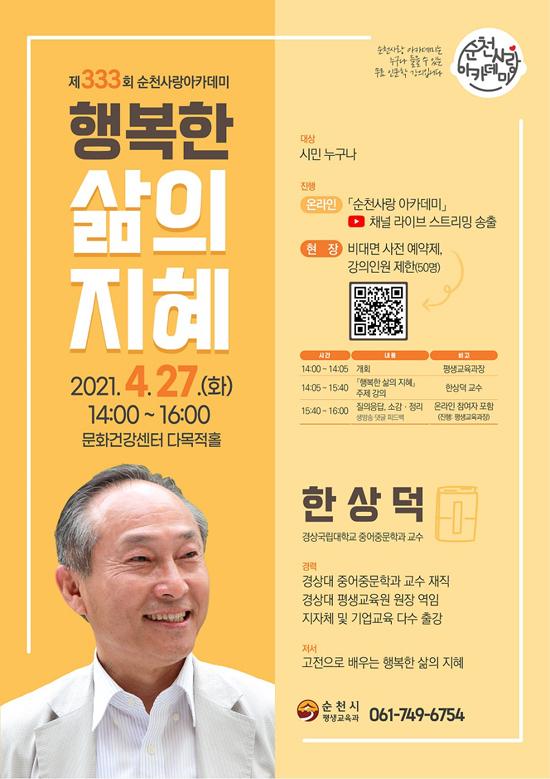 오는 27일 오후 2시 순천시 문화건강센터 다목적홀에서 개최되는 순천사랑아카데미는 고전인문학 분야에서 명성이 높은 경상국립대 중어중문학과 한상덕 교수를 초청하여 ‘행복한 삶의 지혜’라는 주제로 진행될 예정이다.