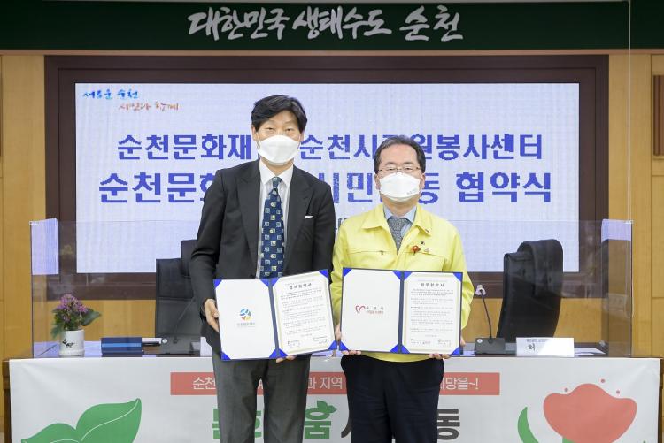순천문화재단(이사장 허석)은 29일 순천시청 소회의실에서 (사)순천시자원봉사센터(이사장 이금옥)와 ‘순천문화틔움’ 시민운동 업무협약을 체결했다.