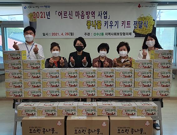동구(청장 임택) 산수2동 지역사회보장협의체(회장 김영순)는 관내 저소득 독거노인 40세대에 어르신 마음방역 사업의 일환으로 ‘콩나물 기르기’ 꾸러미 전달식을 가졌다고 밝혔다.