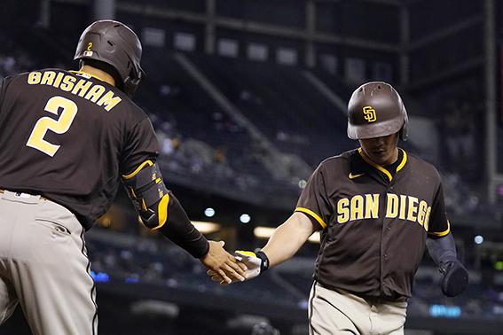 샌디에이고 파드리스의 김하성(오른쪽)이 28일(현지시간) 미 애리조나주 피닉스의 피닉스 체이스필드에서 열린 2021 메이저리그 애리조나 다이아몬드백스와의 경기 5회 말 1타점 적시타를 치고 나간 후 후속 타자의 안타로 득점하고 있다. 2021.04.29.