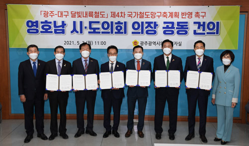 시·도의회 의장들은 이날 광주시의회에서 기자회견을 열고 공동 호소문을 통해 “광주와 대구를 1시간 내로 연결하는 달빛 내륙철도 사업을 동서 화합, 국민통합, 지역 발전을 위해 반드시 필요한 사업이다”며 “단순히 경제적 논리로만 판단할 사안은 아니다”고 밝혔다.