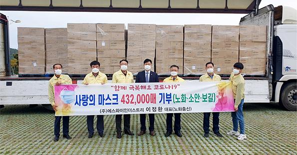 완도군 노화도 출신 기업인인 이정환 대표(㈜에스와이인더스트리)가 노화·소안·보길 주민들을 위해 덴탈 마스크 43만2000매를 기증해 지역 사회를 훈훈하게 하고 있다
