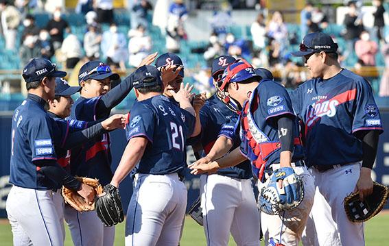 2일 오후 대구 수성구 삼성라이온즈파크에서 열린 ‘2021 신한은행 SOL KBO리그’ 삼성 라이온즈와 LG 트윈스의 경기, 삼성 선수들이 6대 4로 승리한 뒤 기뻐하고 있다. 2021.05.02.