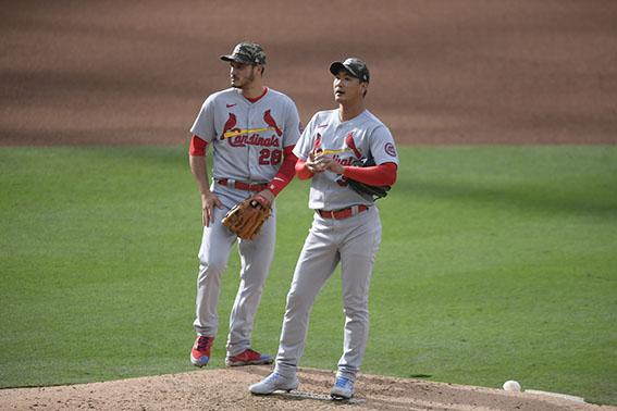 세인트루이스 카디널스 김광현이 16일(현지시간) 미 캘리포니아주 샌디에이고의 펫코 파크에서 열린 2021 메이저리그 샌디에이고 파드리스와의 경기에 선발 등판해 4회 말 교체되기 전 3루수 놀런 아레나도와 함께 마운드에 서 있다.