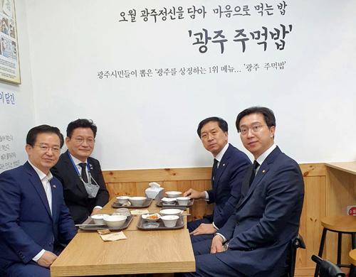 광주지역 정가에 따르면 더불어민주당 송영길 대표와 국민의힘 김기현 대표 권한대행 겸 원내대표가 이날 오전 5·18 기념식에 참석차 광주를 방문해 송정역 1층 한 식당에서 5·18의 연대와 나눔의 상징인 주먹밥을 먹었다.