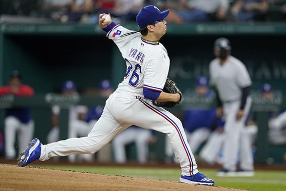양현종(텍사스 레인저스)이 19일(현지시간) 미 텍사스주 알링턴의 글로브 라이브 필드에서 열린 2021 메이저리그(MLB) 뉴욕 양키스와의 홈 경기에 선발 등판해 2회 투구하고 있다. 양현종은 0-0으로 맞선 5회 현재 무실점 호투하고 있다. 2021.05.20.