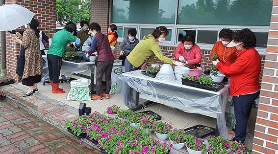 이날 참여한 마을 주민은 작업 전 화훼 전문가인 화원 대표로부터 화분 관리법 설명을 들은 후 코로나19 방역수칙을 지키며 오전 9시부터 ‘사피니아’ 꽃묘를 화분에 심었다.