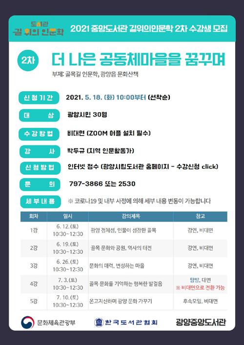광양중앙도서관은 ‘더 나은 우리를 꿈꾸며’라는 큰 틀을 가지고 우리 가족과 마을 공동체라는 두 가지 방향으로 계획한 ‘길 위의 인문학’ 2차 프로그램을 6월부터 운영한다.