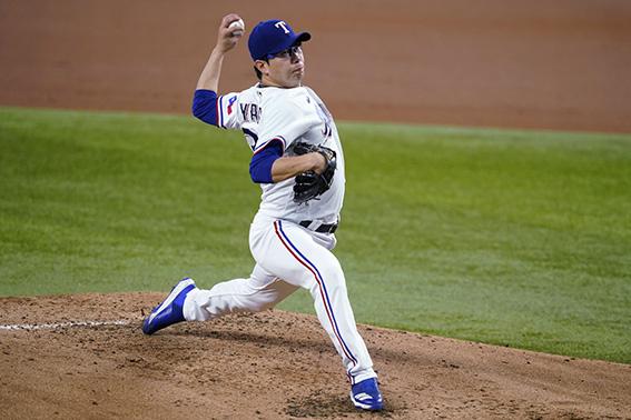 양현종(텍사스 레인저스)이 19일(현지시간) 미 텍사스주 알링턴의 글로브 라이브 필드에서 열린 2021 메이저리그(MLB) 뉴욕 양키스와의 홈 경기에 선발 등판해 3회 투구하고 있다. 양현종은 0-0으로 맞선 5회 현재 무실점 호투하고 있다. 2021.05.20.