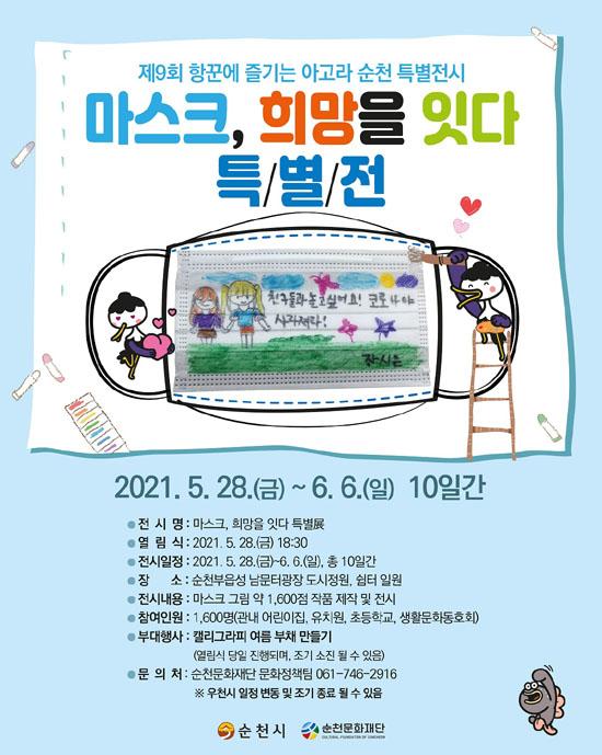 순천문화재단은 오는 6월 6일까지 10일간 순천부읍성 남문터 광장에서 지역대표예술제인 2021 항꾼에 즐기는 아고라 순천의 특별기획전 ‘마스크, 희망을 잇다’를 개최한다.