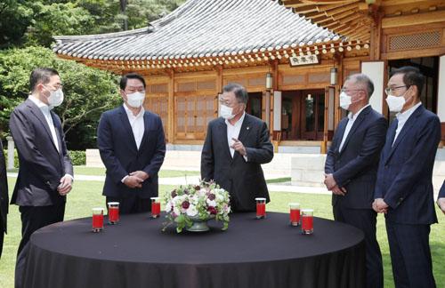 문재인 대통령이 2일 청와대 상춘재에서 4대 그룹 대표 초청 간담회에 앞서 환담하고 있다. 왼쪽부터 구광모 LG그룹 회장, 최태원 SK그룹 회장, 문재인 대통령, 정의선 현대자동차그룹 회장. 김기남 삼성전자 부회장.