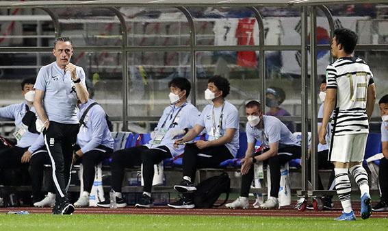 9일 오후 경기 고양시 고양종합운동장에서 열린 2022년 FIFA 월드컵 아시아 지역 2차 예선 대한민국과 스리랑카의 경기, 대한민국 파울루 벤투 감독이 이기제를 바라보고 있다. 2021.06.09.