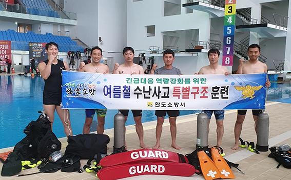 완도소방서는 지난 18일 광주 남부대학교 수영장에서 119수상구조대 운영 대비 및 피서철 수난 사고에 대응하기 위한 인명구조훈련을 실시했다.