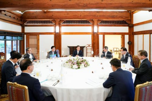 문 대통령은 "아시다시피 지난 달 방미 그리고 한미 정상회담을 성공적으로 마친 후에 얼마 전에 G7 정상회의 그리고 오스트리아와 스페인 국빈방문을 마치고 돌아왔다"며 "그 성과를 요인들께 직접 설명드리기 위해서 모셨다"고 설명했다.