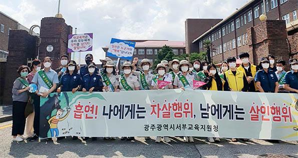 광주서부교육지원청이 광주광산경찰서 학교전담경찰관, 패트롤맘 광주지부, 전남공고 교직원 및 학생회와 함께 전남공고 일대(원룸촌, 어린이집 근처)를 중심으로 ‘교외흡연 예방교육 캠페인’을 지난 6월30일~7월9일 3차례에 걸쳐 실시했다.