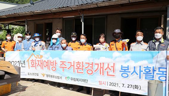 이날 봉사활동에는 포스코, 북부소방서, 북부소방서 의용소방대, 우림복지재단 등에서 총 20여 명이 참여해 북구 망월동 등 관내 취약가구 2곳의 전열기구 교체, 전기 배전판 수리, 주택용 소방시설(소화기, 주택용 화재경보기) 설치, 도배, 지붕 처마 보수 등 화재안전을 위한 집수리를 했다.