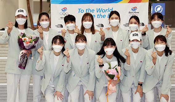 도쿄올림픽 여자배구 선수단이 9일 인천국제공항 2터미널을 통해 귀국, 기념촬영을 하고 있다. 2021.08.09.
