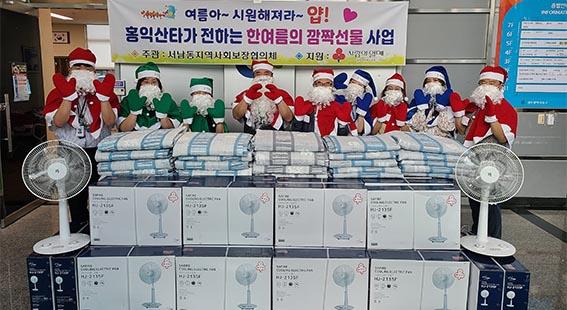 홍익산타의 깜짝 방문에 한 어르신은 “더운 날씨에 산타 복장까지 하고 방문해줘서 너무 미안하고 감사하다”면서 “더운 날씨 탓에 밤잠 설치기 일쑤였는데 여름 선물 시원하게 잘 사용하겠다”고 고마움을 전했다.