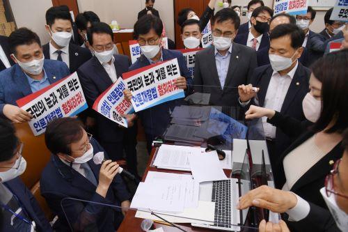 국민의힘 소속 의원 50여명을 회의 시작 전부터 긴급 소집해 언론중재법 개정안을 밀어붙이는 민주당을 규탄하며, '국민의 눈과 귀를 막는 언론재갈법 철회하라' '언론재갈 언론탄압 무엇이 두려운가' 등 피켓을 들고 반대 시위를 벌이기도 했다.