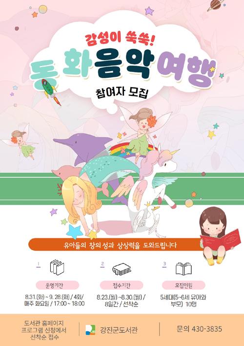 강진군도서관이 관내 5~6세 유아와 부모를 대상으로‘감성이 쑥쑥, 동화와 함께하는 음악여행’ 독서문화 프로그램을 마련했다.