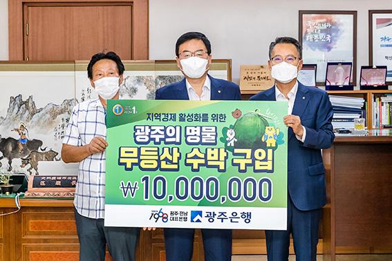 광주은행은 23일 광주 북구청에서 송종욱 은행장, 문인 북구청장, 김영기 무등산수박생산자조합 회장 등이 참석한 가운데 무등산수박 1000만원 상당을 구매했다.