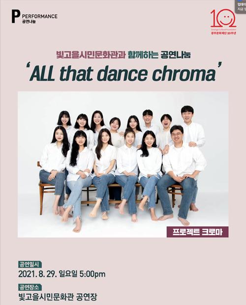 광주문화재단은 29일 오후 5시 빛고을시민문화관 2층 공연장에서 프로젝트 크로마(Chroma)의 ‘올 댓 댄스 크로마(All that dance Chroma)’ 공연을 선보인다고 24일 밝혔다.