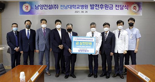 남양건설은 26일 전남대 병원 행정동 회의실에서 열린 전달식에서 마형렬 회장이 발전·후원금 3000만원을 안영근 병원장에게 기탁했다고 밝혔다.