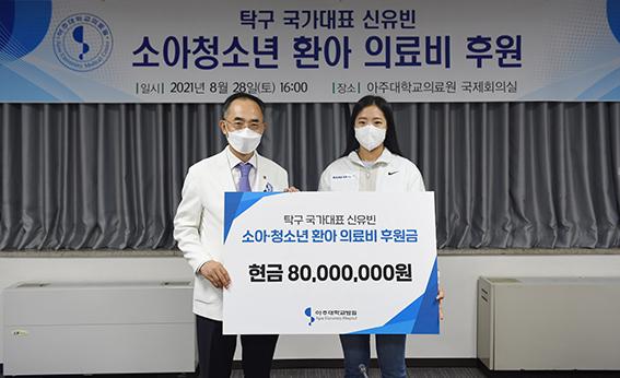 한상욱 아주대병원장은 “코로나19로 환자, 의료진 모두 많이 지치고 힘든 가운데 국민들에게 큰 기쁨과 희망을 준 신유빈 선수가 아주대병원의 소아, 청소년 환자를 위해 기부해 주신 것에 감사드린다. 병마와 함께 경제적 어려움으로 더 고통받는 환아 들을 위해 소중하게 사용하겠다”고 고마워했다.