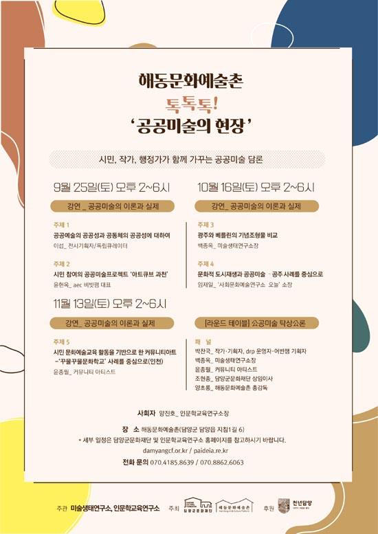 담양 해동문화예술촌이 미술생태연구소, 인문학교육연구소와 함께 오는 오는 25일부터 공공미술을 주제로 월간 아트 토크쇼 ‘톡톡톡’을 3차례 진행한다.