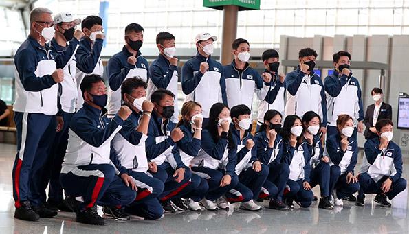 2021 세계양궁선수권대회에 참가하는 남녀 양궁 대표팀이 15일 오후 인천국제공항에서 출국에 앞서 기념촬영을 하고 있다. 2021.09.15.