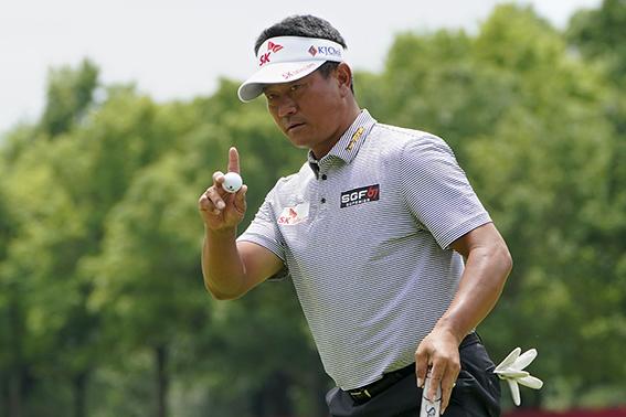 최경주가 30일(현지시간) 미 오클라호마주 털사의 서던힐 컨트리클럽에서 열린 키친에이드 시니어 PGA 챔피언십 최종라운드 6번 그린 라운딩을 마치고 갤러리에 인사하고 있다. 최경주는 최종합계 3언더파 277타로 공동 3위를 기록하며 지난해 챔피언스 투어 진출 이후 최고 성적을 거뒀다. 2021.05.31.